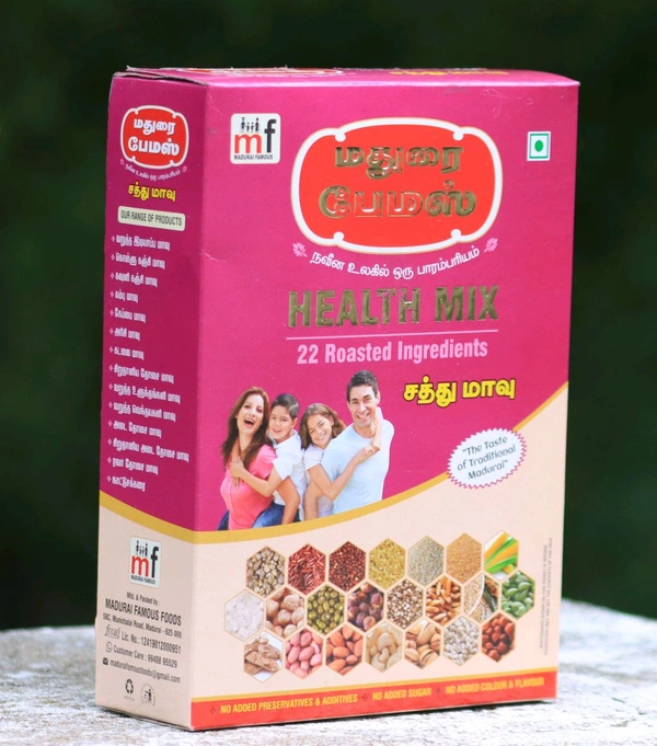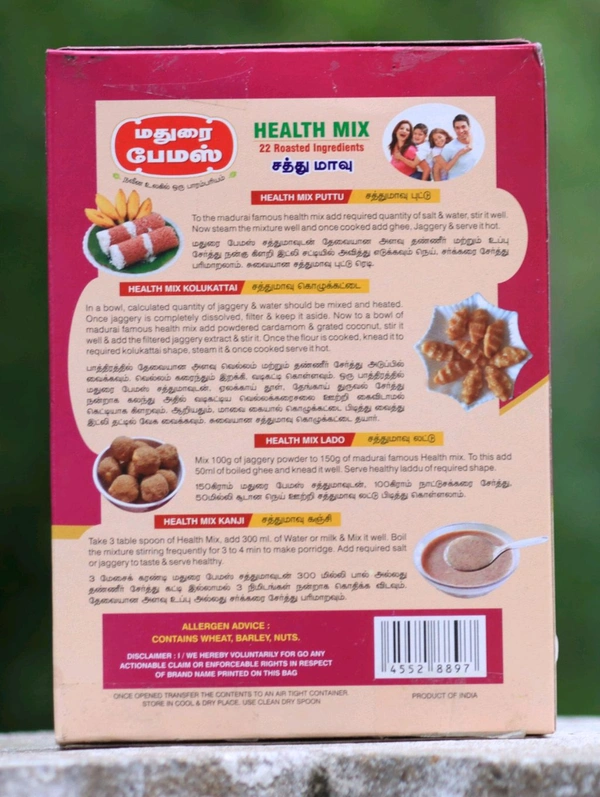 Mix 100g of jaggery powder to 150g of madurai famous Health mix. To this add 50ml of boiled ghee and knead it well. Serve healthy laddu of required shape.